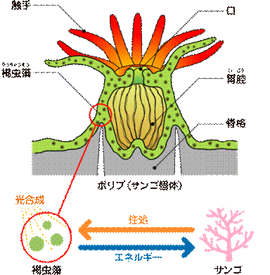 ところが、何らかの原因で海洋中に栄養素が供給されると、共生の必要性がなくなります。例えば、沖縄ではサトウキビやパイナップルなどの農作物を作るために、大量の肥料を農場にまきます。すると、これらの肥料は降雨とともに河川を通じて海洋に流出します。こうして供給された肥料は、サンゴ虫や褐虫藻にとっても必須の食物であり、これらが供給されるうちは、互いに独立した生活を海の中で送ることができます。つまり、豊かな栄養素がばらまかれると、サンゴ虫と褐虫藻は共生を解除して、それぞれが独立してしまいます。褐虫藻がサンゴ虫の体内から抜けてしまうと、「サンゴの白化」という現象が起きます。これは、「サンゴ虫が死んだ」ということではなく、褐虫藻が抜けたために色が白く見えるようになり、「空き家」になったという現象です。